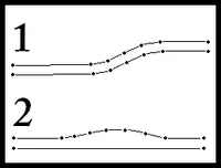 Fig.4 When editing and creating dual carriageways, you should try and keep the nodes and segments parallel and aligned, as in Fig.4, Image 1. If one of the carriageways curves off then nodes don't need to be wasted on the straight carriageway, as in Image 2.