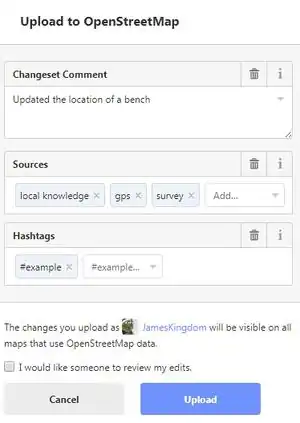 Beim Speichern werden Ihre Bearbeitungen in einem Änderungssatz hochgeladen. Damit wird eine Gruppierung geschaffen und Ihre Änderungen werden leichter nachvollziehbar. Auch Änderungssätze werden mit Attributen beschrieben. iD erwartet hier bspw. eine Quellenangabe und einen Kommentar von Ihnen. Mehrere Quellen können Sie mit Semikola trennen. Im Kommentar beschreiben Sie Ihre Änderungen. Dies erleichtert Anderen die Arbeit und ist insbesondere bei größeren Änderungen unerlässlich. Beispiele für gute Kommentare sind „Geschwindigkeitsbeschränkungen südlich von Frankfurt überprüft, Darmstädter Landstraße fehlt noch“ oder „Öffnungszeiten der Bremer Stadtbibliotheken nach Besuch angepasst“.