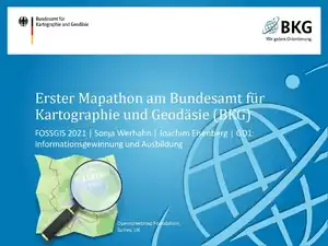 Als Mitglied des FOSSGIS e.V. hat sich das BKG auch zum Ziel gesetzt aktiv in der OSM-Community mitzuarbeiten. Deshalb nimmt das BKG an FOSSGIS-Konferenzen teil und unterstützt diese als Gold-Partner. Außerdem richtet das BKG Mapathons aus und stellt eine Auswahl von POI-Themen der OSM-Community zur Verfügung. Dabei handelt es sich um durch das BKG recherchierte Adresslisten, die über Nominatim geocodiert wurden. In der Geomatik-Ausbildung wird zukünftig gemappt - so tragen unsere Azubis auch zur Erweiterung des OSM-Datenbestandes bei.