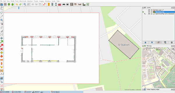 Imagerykann das Bild von der Festplatte oder aus der Zwischenablage geladen werden. - Nach dem Laden wird das Bild in JOSM in voller Größe angezeigt und im Ebenenmenü rechts ist eine neue Zeile für das Bild eingefügt. Es muss die entsprechende Ebene aktiviert werden. Sind bereits Kalibrierungsdaten vorhanden, wird diese automatisch geladen