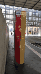 Über eine Notrufsäule kann per Knopfdruck kostenlos eine Sprachverbindung zu einem Notrufzentrum aufgebaut werden. Notrufsäulen an Bahnsteigen sind meistens rot oder orange und mit "SOS" gekennzeichnet.