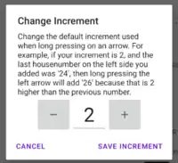 Diess ist besonders interessant, wenn man weiß dass durch eine längeren Klick auf die jeweilite Pfeiltasten automatisch eine Adresse am Fadenkreuz gesetzt wird. Dabei wird die Hausnummer automatisch um ein Inkrement geändert. Das Inkrement kann auf dem Eingabedialog unter der Backspace-Taster (nach oben wischen) geändert werden.