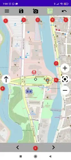 - (6) bei gedrehter Hintergrundkarte wird mit einem Klick die Karte wieder nach Norden orientiert