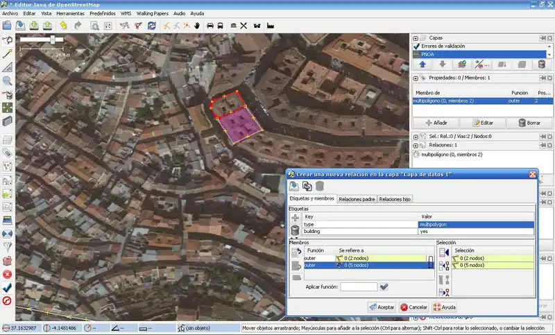 fig.6 Quinta captura de pantalla - Ponemos ambos segmentos de la relación como outer (apartado Función; círculo rojo), y añadimos las etiquetas (elipse azul): type=multipolygon y building=yes. Pulsamos Aceptar.