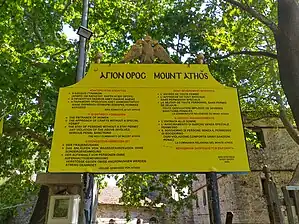 Αν και στο Άγιον Όρος χρησιμοποιούνται οι πινακίδες του ΚΟΚ, (βλ. τις πινακίδες στον δρόμο Δάφνη - Καρυές - Καρακάλλου στο YouTube.), η Ιερά Κοινότητα και η Ιερά Επιστασία έχουν θεσπίσει δικές τους πινακίδες, οι οποίες ισχύουν για συγκεκριμένα ζητήματα της χερσονήσου, ως εξής:
