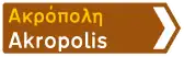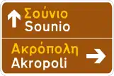 Προειδοποιητική κατευθύνσεως, με αναγραφή κατευθύνσεων για περιοχές μεγάλου τουριστικού ή αρχαιολογικού ενδιαφέροντος. | Βλ. τις γενικές οδηγίες για πινακίδες προορισμού. |