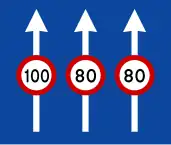 (σημ. επειδή το διάγραμμα της πινακίδας είναι παρωχημένο, χρησιμοποιείστε 130 στους αυτοκινητοδρόμους και 110 στις οδούς ταχείας κυκλοφορίας.) | |