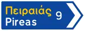 | Π-9 | Κατεύ8υνση μίας τοπωνυμίας, μορφής ορθογωνίου. | Βλ. τις γενικές οδηγίες για πινακίδες προορισμού. | |