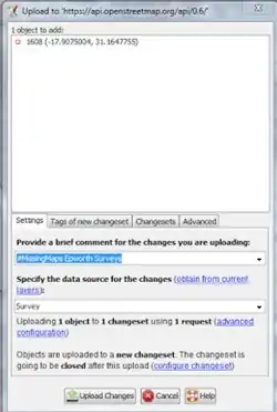 This shows only one node being uploaded, but yours should show as many as you’ve created. Please write #MissingMaps #EpworthSurveys in the comment box, and write Survey in the data source. If you’ve used Bing imagery for anything, include that as well, separating them with a semicolon and a space, i.e. Survey; Bing