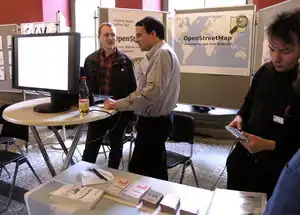 There was going to be an OSM booth organized by User:Joto and User:Frederik Ramm and manned by community members. There was three(!) talks about OSM and a discussion/workshop-like event.