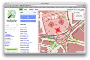 Une zone de données brutes peut être chargée dans la zone visible de la carte, et les éléments bruts des données d'OpenStreetMap (nœuds et chemin) peuvent être sélectionnés soit par clic sur la carte elle-même, ou bien dans la liste des objets présentée sur le panneau de gauche.