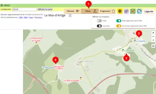 - On peut avec le bouton Filtres (1) masquer les voies et/ou masquer les lieux déjà rapprochés s'il y en a trop.