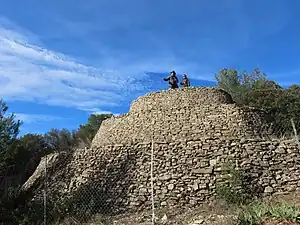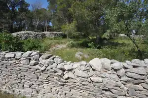 La capitelle ou cabane en pierres sèches est une construction fréquente dans nos garrigues, bâtie sans l'utilisation de liant, de mortier. Une autre caractéristique importante est sa voûte à encorbellement ou fausse voûte constituée de pierres plates disposées généralement en assises circulaires, chacune reposant légèrement en surplomb sur la précédente. Ces constructions sont souvent accompagnées de murs d'enclos; de murs de soutènement de terrasses, de clapiers (tas de pierres), témoins émouvants du travail acharné des défricheurs qui ont durant des siècles cultivé ces terres arides, pauvres et délaissées ou les pierres "poussaient" plus vite que leurs ceps de vigne ou leurs oliviers !