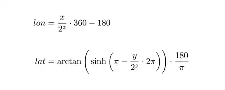 - y va de 0 (le bord supérieur est à la latitude 85,0511° Nord) jusqu'à 2zoom -1 (le coin inférieur est à la latitude 85,0511° Sud) dans une projection Mercator