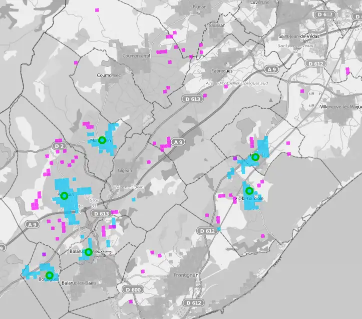 - pastille cyan: absence probable de bâtiments (testé autour du centre administratif de la commune)