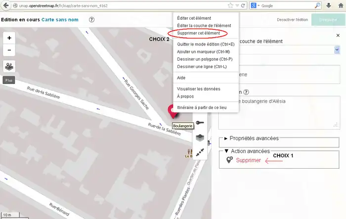 - 地物を削除するには地物を選んで「拡張アクション」をクリックし「削除」、またはアイテムを右クリックして「地物を削除」。
