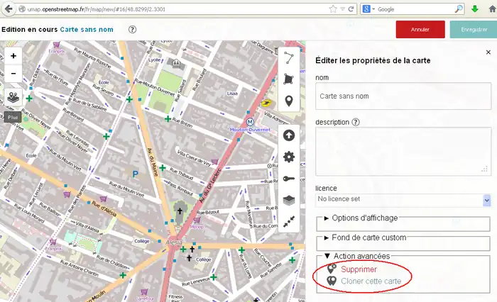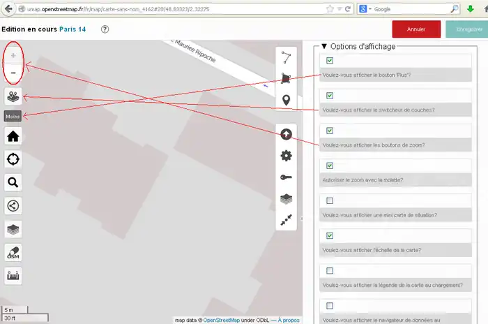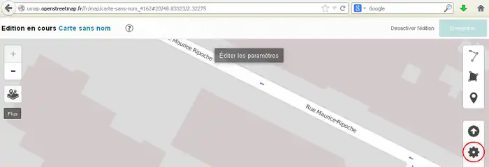 2) 左サイド7番目のボタンをクリックしてその右に開いた窓で「東京駅」などのように移動先を指定してエンターキーを押します。(2014/11/30現在、この機能はフランスの製品版インスタンスでは無効です。他(例えば http://umap.fluv.io )では有効です。)