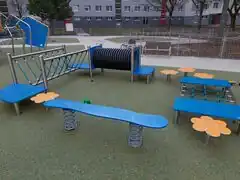 agility_trail node way A series of structures for kids to climb, balance, jump, and swing their way through (such as balance beams, climbing walls, monkey bars or wobbly bridges)