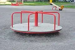 Some playground facilities (that might require a fee to enter) offer small attractions like carousels and similar. Those features are described here: attraction=*.