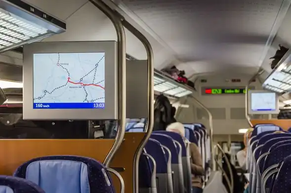 OpenStreetMap in an IC2 carriage (Deutsche Bahn). The map shows the current location of the train and highlights the stations.