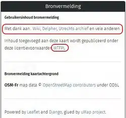 uMap geeft de mogelijkheid de licentie en bronvermelding van de uMap kaart aan te geven.