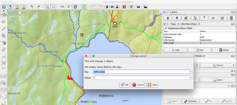 Følgende skjermbilde fra JOSM viser noen typiske mtb-tags for et segment av en sti i Bymarka, Trondheim. Årsaken til at man kan se høydekurver og myrterreng er at Statkart N50 er satt som bakgrunnslag (som i pkt 3 ovenfor), og årsaken til at stiene her har fått farge er at mtbmap-stilsettet er brukt (som i pkt 4 ovenfor). Skjermbildet viser også hvordan taggene på format key=value settes inn.