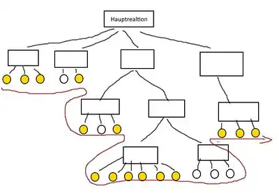 • If you want to extract the main hiking trail from this hierarchic structure, you have to flatten out the whole structure into one big one-dimensional list of ways. That means that you follow down the hierarchie until you find the first way and then take the next one. This is called depth-first_search. An example is also indicated by the red line in the diagram. After that you ignore everything that is not a way and is not tagged with the role main (forward and backward can be considered later). This should give us a linear route that contains all elements from the main route in the correct direction.