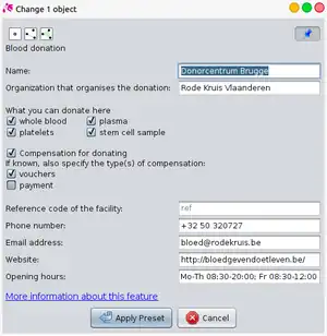 | blood:platelets | yes/no | Whether or not you can donate platelets here. This is done with a plateletpheresis device. |