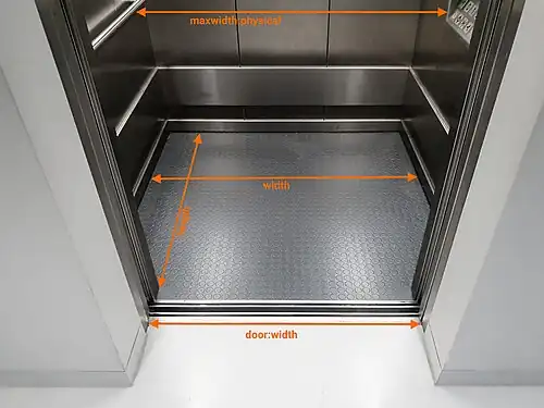 maxwidth:physical=* Maximum usable space perpendicular to the direction someone enters or exits that is available on the whole height of the elevator. This means the base width=* minus any obstructions reaching into the elevator cabin, like handrails or control consoles.