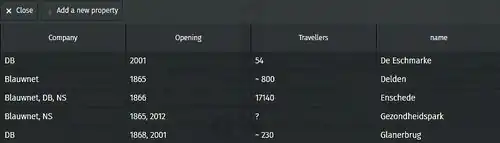 The size of the table grows by adding properties. New properties are added alphabetically. The example was created by adding Travellers, subsequently Company and lastly Opening.