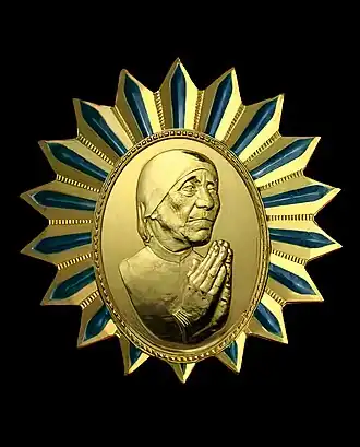 The "Mother Teresa" Decoration is an honorary decoration of the Republic of Albania given to Albanian and foreign citizens for outstanding acts of humanity towards the Albanian nation and the world. Named after the Catholic nun and saint Mary Teresa Bojaxhiu, the decoration is given by the President of Albania.[2][3] The proposer could be the President or institutions of authority (Prime Minister, Assembly, Ministries, independent bodies, etc.).[4] The Mother Teresa award is considered the highest award in Albania.