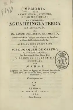 Sarmento set up a profitable distribution network for Água de Inglaterra in Portugal and it became one of the most widely used drugs in the country. Others, including Castro Sarmento's nephew who claimed his uncle had shared the formula with him, produced their own counterfeit versions.[3][6] The rights of the nephew's son in this regard were disputed in the Portuguese Parliament as late as 1821, having earlier been endorsed by the Prince Regent.[1] Two pharmacists in Lisbon also produced their own versions.[5]