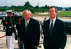 Göncz was an avid supporter of Hungarian integration with the West, especially with the United Kingdom.[70] In May 1990, Charles, Prince of Wales and his wife Diana undertook an official visit to Hungary and made history by becoming the first members of the British royal family to visit a former Warsaw Pact country.[73][74] The royal couple were met at the airport by their host, newly elected interim President Göncz,[74] who later hosted an official dinner to welcome the royal couple.[74] Elizabeth II visited Hungary in May 1993, also welcomed by Göncz.[75] He argued in favor of Hungary's accession to NATO and the European Union. He was also an enthusiastic supporter of U.S. President Bill Clinton's "Partnership for Peace" in Central Europe.[76] As a result, in 2000, he was honored with the Vision for Europe Award for his efforts in creating a unified Europe.[77] Göncz's commitment towards the Western world earned some domestic negative criticism; in 1991, the far-right politician István Csurka, later defector from MDF and founder of the nationalist Hungarian Justice and Life Party (MIÉP) accused him of being a tool of France, Israel, and the United States.[17] During Göncz's presidency, Pope John Paul II visited Hungary twice, in August 1991 and September 1996. They had already known each other through a common Polish friend, before John Paul's papacy.[78]