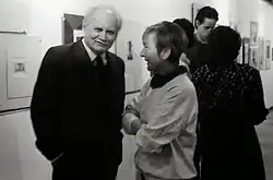 In a June 1995 speech, Göncz recalled the 1956 events as a "turning point" in his life which determined his fate until the end of his life,[20] despite the fact that he did not participate in the armed resistance and uprising. On 23 October 1956, he was present at the peaceful mass demonstration, which marched in front of the Hungarian Parliament Building, along with his eldest daughter Kinga, who was nine years old at that time.[21] Göncz's role in the October 1956 events remained fragmented. By 29 October 1956, he assumed a political role in the events. He participated in a meeting at Prime Minister Imre Nagy's house, when Nagy was informed about the Suez Crisis and the Prime Minister said "Gentlemen! From now on, we need to discuss another thing because there is a dangerous possibility of a Third World War". Göncz worked as an activist in the newly recreated Hungarian Peasant Alliance during the revolution.[21] In a 1985 interview, Göncz said he sympathized with the political vision of Imre Nagy. He also added, that he would join a Nagy-led Hungarian Socialist Workers' Party (MSZMP), if the Soviet intervention does not take place. Göncz noted the Nagy government and the new communist party would have started with a clean slate.[22] Sociologist Péter Kende has said Göncz's belief in "democratic socialism" was similar to that of István Bibó.[23]