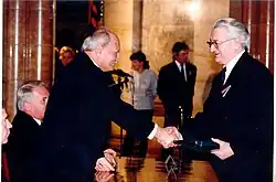 On 1 May 1988, Göncz also participated in the foundation of the Network of Free Initiatives (Hungarian: Szabad Kezdeményezések Hálózata; SZKH), the predecessor organization of the Alliance of Free Democrats (SZDSZ).[55] Initially, SZKH was a loose alliance of various independent civil groups, which intended to become an umbrella organization like the Solidarity in Poland. However, because of the widespread pluralism, the SZKH's operation proved to be slow and time-consuming in the midst of accelerated events, thus on 13 November 1988, the majority of the organization decided to found the SZDSZ, Göncz was also a co-founding member and helped the formulation of the founding declaration. Ferenc Miszlivetz said, Göncz was an observer rather than an active proponent in the following rallies.[56] In addition to MDF and SZDSZ, the third major anti-communist block was the liberal Alliance of Young Democrats, later known mostly by its acronym Fidesz. Göncz's former party, the Independent Smallholders' Party (FKGP) was re-established in those days, he visited the party's inaugural session at the Pilvax Café but, for him, it was not attractive anymore, as most of the former members of the FKGP were already dead or stayed in emigration.[57] Göncz considered the old debates between the "rural-national" and "urbanist" trends are outdated and detrimental after decades of communist rule, his liberal ideology became more dominant by 1988.[58]