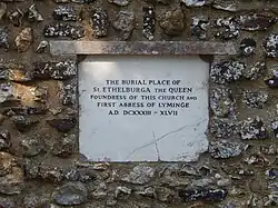 Æthelburh of Kent (born c. 601,[1] sometimes spelled Æthelburg, Ethelburga, Æthelburga; Old English: Æþelburh, Æðelburh, Æðilburh, also known as Tate or Tata),[2][3] was an early Anglo-Saxon queen consort of Northumbria, the second wife of King Edwin. As she was a Christian from Kent, their marriage triggered the initial phase of the conversion of the pagan north of England to Christianity.