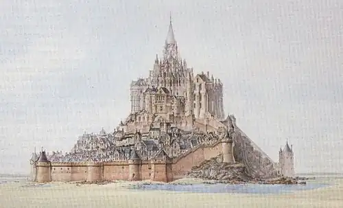 Later, he developed an interest in medieval architecture, and was an active participant in the restoration of Soissons Cathedral. In 1871, he was attached to the Commission of Historical Monuments. Three years later, after a preliminary study, he was engaged to do restorative work at Mont-Saint-Michel Abbey, with Paul Gout as his assistant, and published several studies. While working there he brought his maid, Anne Boutiaut Poulard, who later opened a restaurant and created the famous "Omelette de la mère Poulard".