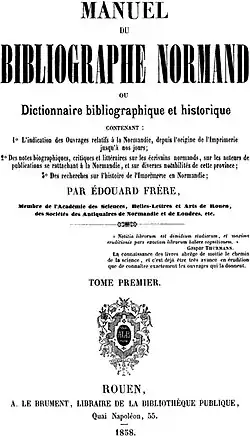 After he published these successful local studies, Frère engaged in his opus magnum, the monumental Manuel du Bibliographe normand. It was the outcome of a vast research and information gathered from several Norman scholars, which took him five years to complete. This book answered perfectly the expectations promised by its title. Frère owes the better part of his literary and bibliographical notoriety to this work, which ended in every scholar's hands.