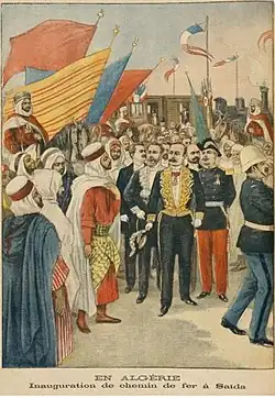 In December 1899 a French scientific mission encountered a large group of armed Saharan people in the Tidikelt(fr).[11] The mission's military escort chose to fight, quickly routed the Saharans, and occupied the In Salah oasis. It has been said that Laferrière deliberately provoked the incident. Certainly he wanted an excuse to extend French influence.[11] A poorly managed military campaign ensued in 1900, meeting little resistance but suffering greatly from heat and lack of water over the summer, with huge losses of camels. Part of the problem was lack of cooperation between Laferrière and General Crisot of the 19th Army Corps.[12] Laferrière resigned from his position as Governor General.[9] He was replaced by Charles Célestin Jonnart, Deputy of Pas-de-Calais, as Acting Governor General on 3 October 1900.[7]