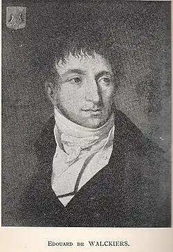 Édouard de Walckiers' first marriage was in 1783 to Barbe de Reul (1767-1791), with whom he had one child, Louise Jeanne (1784-1825), who in 1801 married count Alexandre Batowski (1758-1824). In 1799 he married his second wife, Rose-Françoise Renaut (1773-1837), with whom he had Charles-Louis, 3rd viscount de Walckiers (1793-1849) and Alphonse 4th viscount de Walckiers (1814-1879), who had issue.[4]