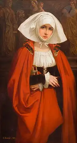 At the Exposition Universelle of 1900, the primary theme of which was Art Nouveau, her 1895 painting 'Le Sommeil de la Vierge' (Sleep of the Virgin), was awarded a bronze medal, and the Henri Lehmann prize of 3000 francs by L'académie des Beaux-Arts.[3] From 1900 onwards she confined her painting to portraits, scenic Brittany landscapes, and the occasional flower study. She made regular painting trips to Brittany, inspired by the forest of Brocéliande, and from 1910 to various places on the coast such as Concarneau, Plougastel, Pont-l'Abbé and Loctudy, often staying at inns and accompanied by one or two students. She painted several works in Le Faouët before constructing a villa in La Baule in the 1930s. Working mainly in watercolour and gouache, she discovered a ready supply of models among young girls in the area, and found Bretons generally to be friendly, honest and self-confident.[4]