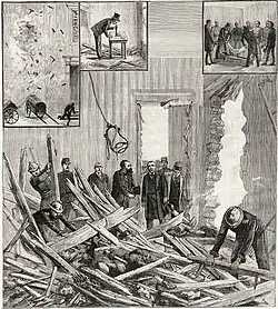He began manufacturing explosives to target the headquarters of the Carmaux Mining Company, whose address he found in the directory.[10] For this attack, he was likely assisted by his brother and the anarchist activist Adrienne Chailliey, a close associate of Henry who had already given him shelter several times.[11][5] After assembling the bomb, he took advantage of a moment when his employer sent him on an errand in Paris to place it at the company’s headquarters.[10] However, the building's concierge noticed the suspicious package and alerted the police.[10] Officers arrived, retrieved the package, and, accompanied by a company employee, brought it to the police station on Rue des Bons-Enfants.[10][12] There, the bomb exploded as the officers opened it, killing four policemen and the employee.[10][12] The Carmaux-Bons Enfants bombing was the deadliest incident of the Ère des attentats.[12]