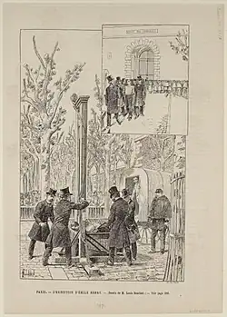 He repeated the second part of his exclamation before the executioners seized him and placed him into the execution device. He was guillotined shortly thereafter, his head falling into the basket in front of the guillotine.[22] His death certificate recorded the approximate time of death as 4:10 AM.[22]