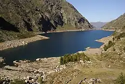 Étang de Soulcem is a large artificial lake in the Pyrenees mountains in Ariège, France. It is at an elevation of 1570 m and is used for hydroelectricity, generating 62 GWh/year. The lake, which has a surface area of 0.91 km2, was formed following the construction by Électricité de France of a dam across the northern end of the Vicdessos valley in 1980–1983.