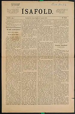 Ísafold was an Icelandic newspaper, published weekly. It was founded in 1874 by the politician Björn Jónsson,[1] who was the editor until 1909, when he became prime minister.