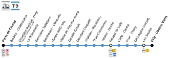 Île-de-France tramway Line 9 (usually called simply T9 and formerly known as Tramway Porte de Choisy - Orly Ville or TPO) is a tram line which is a part of the modern tramway network of the Île-de-France region of France. Line 9 connects Porte de Choisy Paris Métro station and the centre of Orly (Place Gaston Viens) serving suburbs in the south-east of Paris.[1] Line 9 does not serve Orly Airport, which is currently served by tramway Line 7. The line has a length of 10.3 km (6.4 mi) and 19 stations.[1] The line opened to the public on 10 April 2021.[3]