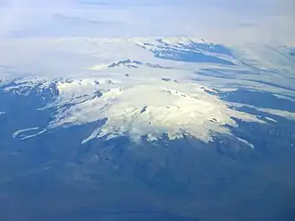 Öræfajökull has erupted twice in historical times, in 1362 and 1728. These were explosive silicic eruptions with bulk tephra volumes of 0.1–10.0 km3 (0.024–2.399 cu mi) and jökulhlaups occurred.[2] The deposits closer to the central volcano are rhyolytic but the more distal lava flows which can extend for 20 km (12 mi) from the caldera are alkali olivine basalt and both have been erupted in the Holocene.[2]