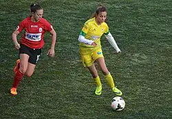 Özge Özel (left) playing for Konak Belediyespor in the away match of the 2014–15 season against Kireçburnu Spor.