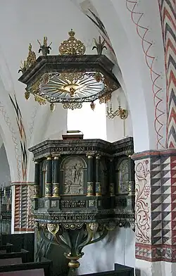The pulpit, constructed in the 1590s, was likely designed by Mikkel van Groningen who also built the pulpit at the Aarhus Cathedral. It is decorated with scenes from the bible, including: the fall of man, the crucifixion, and the resurrection. The scene depicting the fall of man is inscribed, in latin, with the phrase: "With Adam death came into the world." Above the pulpit hangs a sounding board, which prevents speeches from being quieted by the church's high vaults. An inscription on the podium reads: "There is nothing to remove, nothing to add" (“Intet at trække fra, intet at lægge til”).