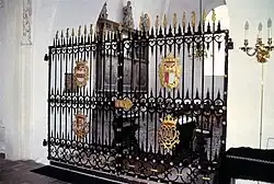 The southern wing of the choir houses a burial chapel with raised sarcophagi . The chapel is decorated with allegorical paintings. A northern wing of the choir was later built and used as a burial chapel for Peder Skram. The northern wing was demolished in 1856, and the graves therein were moved to the churchyard. A memorial to Peder Skram and his wife was designed by Otto Evens and erected in 1886.[5]
